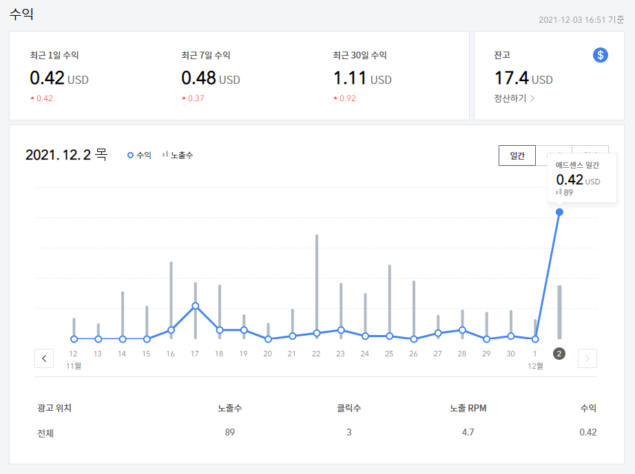 어쨌든 나의 목적은 티스토리로 블로그 수익을 내는 것이고 그 목적에 맞춰서 꾸준히 포스팅을 시작했다. (협찬이나 광고X) 그런데 하루만에 수익이 났다.